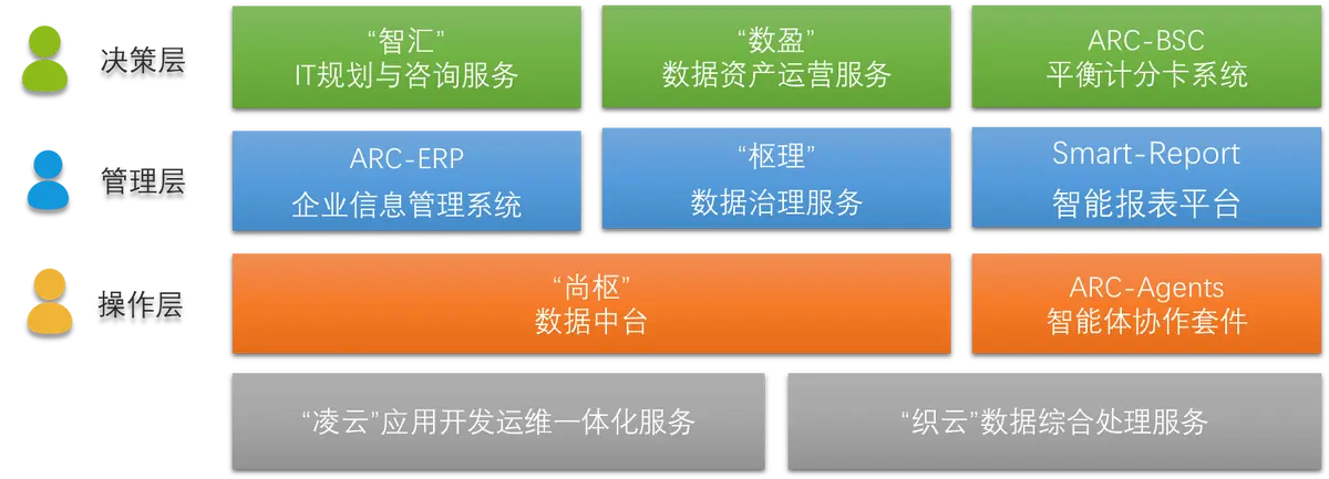 管理層,ARC - ERP企業(yè)信息管理系統(tǒng),整合企業(yè)人、財(cái)、物等資源,實(shí)現(xiàn)生產(chǎn)、采購、銷售等業(yè)務(wù)流程數(shù)字化管控,提升運(yùn)營效率;“樞理”數(shù)據(jù)治理服務(wù),規(guī)范數(shù)據(jù)標(biāo)準(zhǔn)、清理數(shù)據(jù)質(zhì)量問題、保障數(shù)據(jù)安全,為管理決策提供可靠數(shù)據(jù)底座;Smart - Report智能報(bào)表平臺(tái),自動(dòng)抓取多源數(shù)據(jù),快速生成可視化報(bào)表,實(shí)時(shí)呈現(xiàn)業(yè)務(wù)動(dòng)態(tài),輔助管理者精準(zhǔn)洞察、高效決策 。