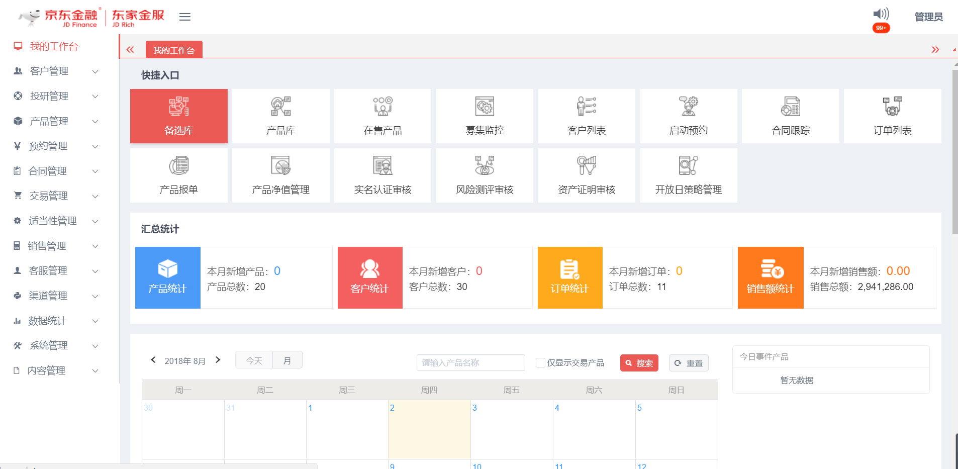- 我的工作臺(tái):提供系統(tǒng)菜單快捷入口,統(tǒng)計(jì)核心業(yè)務(wù)數(shù)據(jù)及開(kāi)放期內(nèi)的產(chǎn)品日歷事件展示