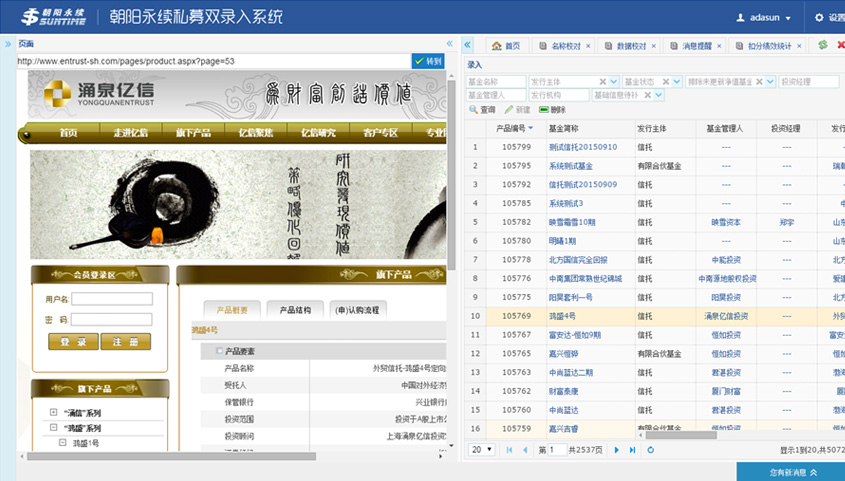 - 錄入系統(tǒng):使用錄入系統(tǒng)錄入基金產(chǎn)品和凈值信息,提交校對(duì)人員校對(duì)。高權(quán)限人員可分配隊(duì)列中的任務(wù)給指定的錄入人員等