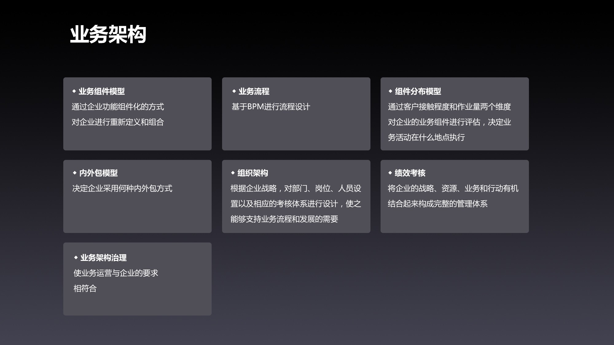 業(yè)務架構從企業(yè)高層視角,“智匯”助力領導者、董事會與股東,借ARC - BSC平衡計分卡系統(tǒng)等決策層工具,清晰洞察運營計劃、價值與挑戰(zhàn),精準錨定戰(zhàn)略方向。在業(yè)務模式重塑上,以業(yè)務組件模型為抓手,通過企業(yè)功能組件化的方式,對企業(yè)進行重新定義和組合,聯(lián)動“數(shù)盈”數(shù)據(jù)資產運營等服務,打破傳統(tǒng)邊界,構建契合戰(zhàn)略的全新業(yè)務運營模式 。